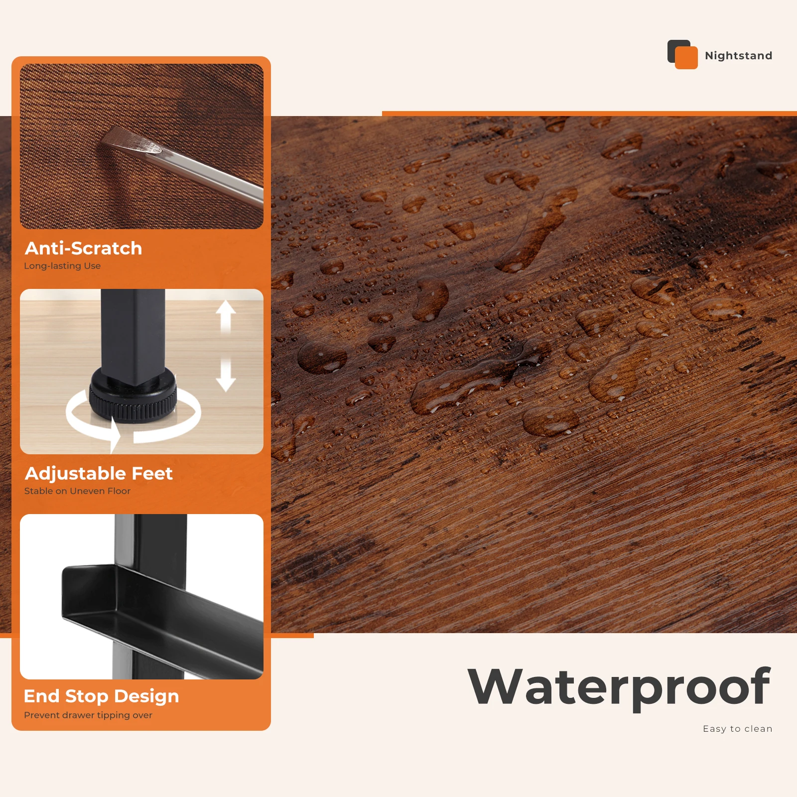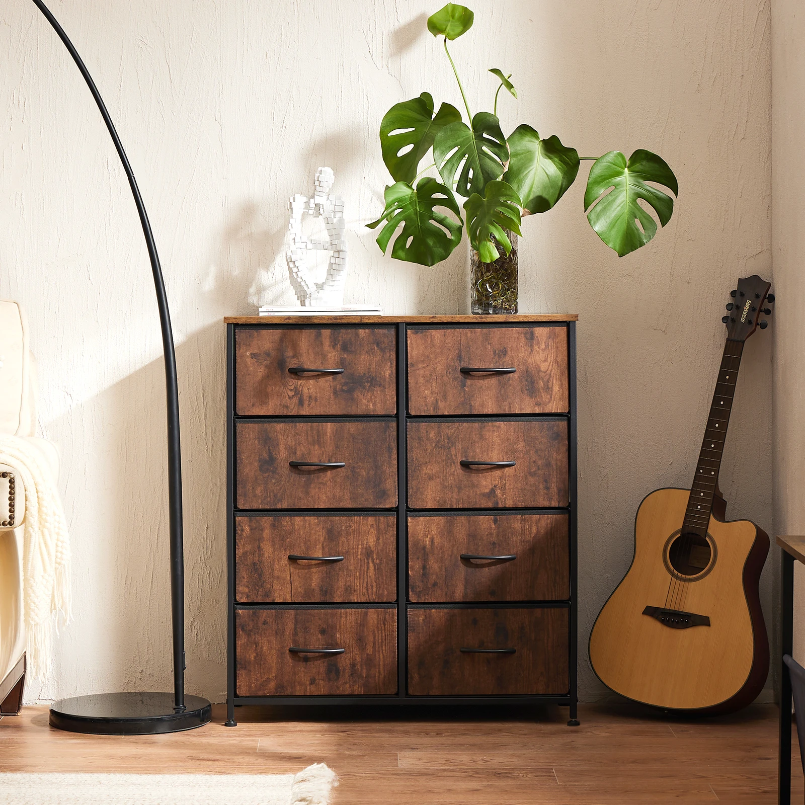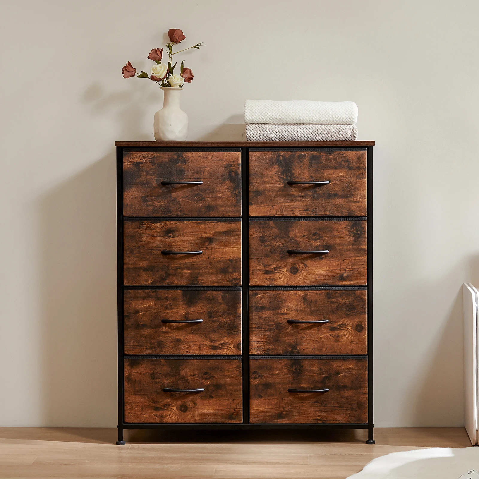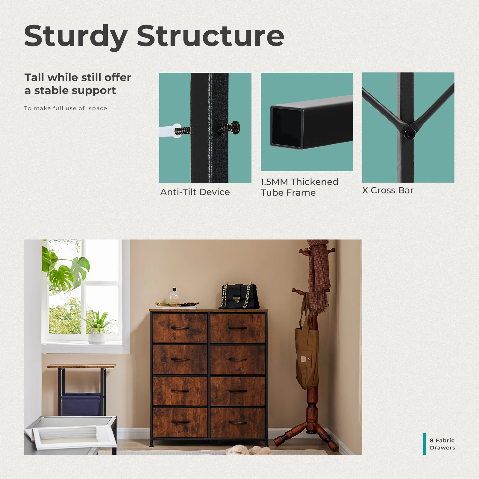 Sturdy Frame: The high-quality metal frame extends the lifespan of the chest of drawers while keeping the chest of drawers stable and sturdy at any time. With 4 height-adjustable feet to protect your floor from scratches, you can also adjust the balance of the chest of drawers in small areas. An auxiliary function will be added if you fix the drawers dresser to the wall, as it can prevent possible tilt caused by uneven floor or children climbing.