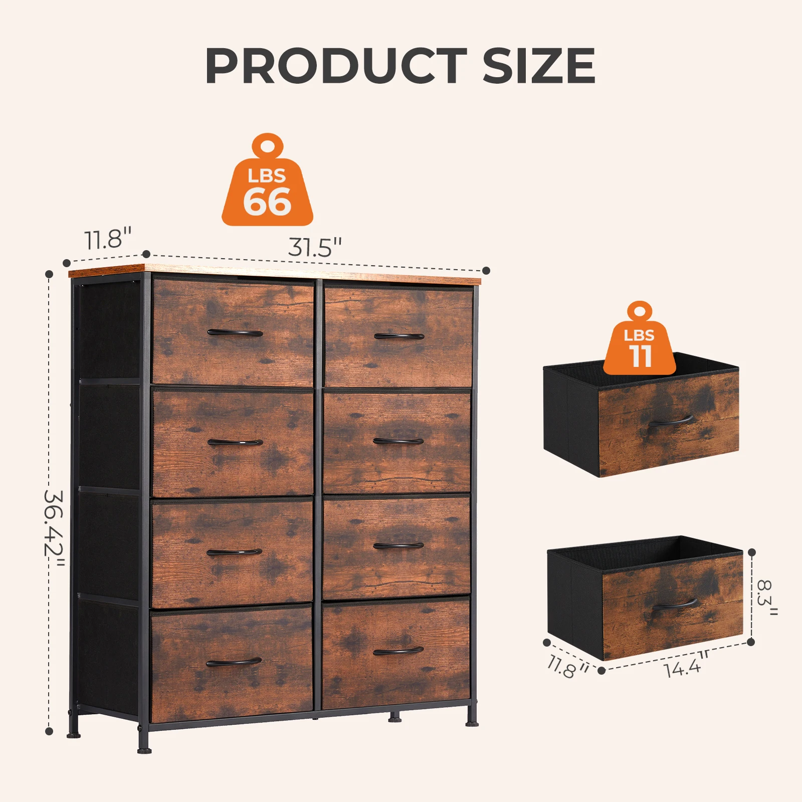 Check FULL-size: This dresser for bedroom with fabric bins will save your space and is a great piece of furniture to store such as magazines, clothes, or children's toys. The wooden board at the top has a load-bearing capacity of up to 66 pounds and can be used instead of a TV stand.